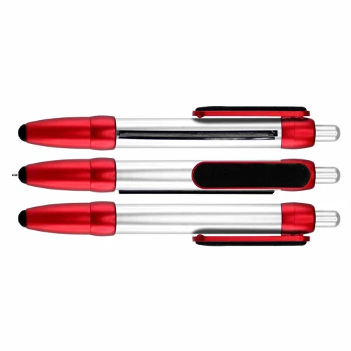 Bolígrafo plástico modelo "Flag", con cuerpo plateado y terminales de color metalizado. Incluye bandera retráctil de tela (para impresión), puntero "Touch-Screen" y clip gamuzado negro para limpiar pantalla táctil. Escritura azul.