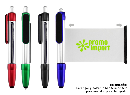 Bolígrafo plástico modelo "Flag", con cuerpo plateado y terminales de color metalizado. Incluye bandera retráctil de tela (para impresión), puntero "Touch-Screen" y clip gamuzado negro para limpiar pantalla táctil. Escritura azul.