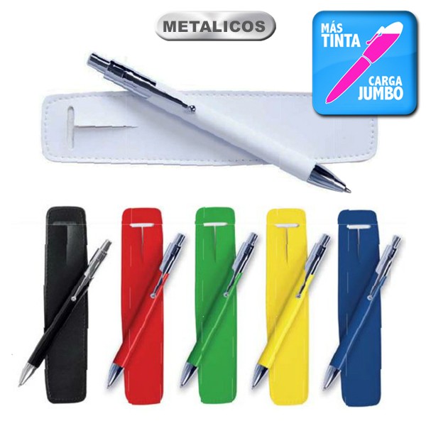 Bolígrafo de mecanismo pulsador en original diseño bicolor. Con cuerpo metálico de suave acabado en alegres colores. Punta y clip en plateado. Presentado en funda de polipiel a juego. De cartucho jumbo y tinta azul. Carga Jumbo. Funda Polipiel