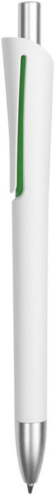 Plástico. Cuerpo blanco mate. Clip, punta y pulsador color plata. Debajo del clip detalle de color. Tinta azul.