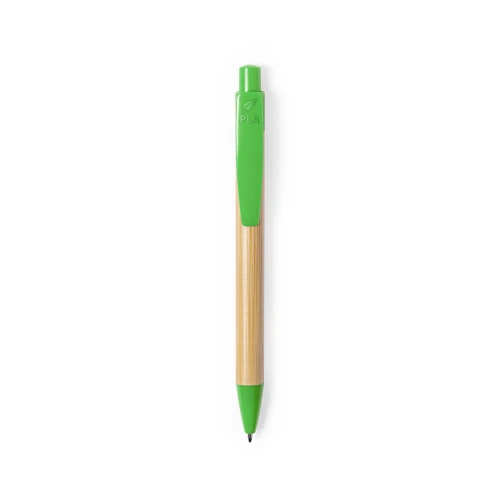 Bolígrafo de línea nature con mecanismo pulsador. Combinación de cuerpo en bambú brillo y accesorios en PLA -Ácido PoliLáctico-, que se obtiene a partir de recursos 100% naturales como el almidón de maíz, la yuca o la caña de azúcar, pudiendo convertirse en 100% compostable al final de su ciclo de vida útil. Clip con amplia superficie de marcaje y disponible en variada gama de colores, con tinta azul. Distintivo PLA en parte superior del clip.