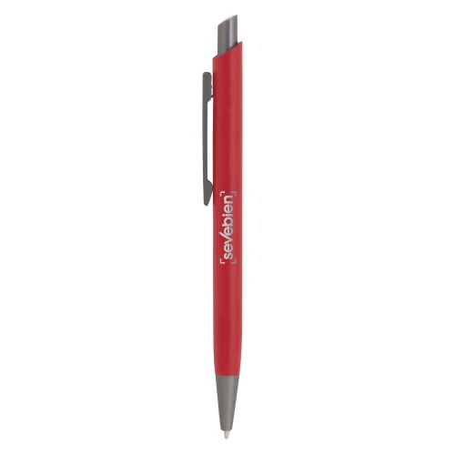 Aluminio, ABS, Acero. Boligrafo retráctil. Cuerpo revestido en laca de diferentes colores. Acabado mate. Pulsador, clip y puntera de color gris gun metal. Tinta azul. Amplia área de impresión.