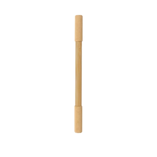 Bolígrafo lápiz eterno 2 en 1 fabricado en bambú. Dispone de un doble cierre de capucha en cartón reciclado. En un extremo, cuenta con un bolígrafo con tinta azul; en el otro, un lápiz eterno que permite escribir de forma continua sin necesidad de reemplazo.Materiales como el Bambú fomentan la utilización de materias primas naturales reduciendo las emisiones contaminantes. Además, el bambú proviene de una planta de gran resistencia y versatilidad, con crecimiento y regeneración rápida, siendo una excelente alternativa al uso de madera tradicional.
