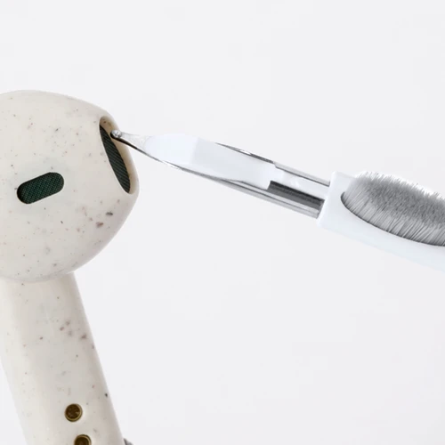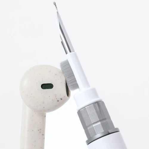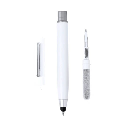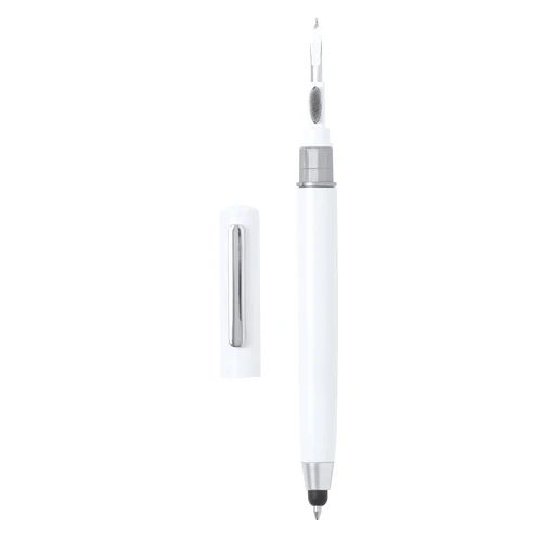 Práctico bolígrafo puntero de mecanismo giratorio, con accesorios de limpieza alojados en la parte superior de la caña. Incluye un cepillo y una punta metálica protegidos por una capucha. Con clip metálico y en tinta azul. Disponible en varios colores y presentado individualmente en caja de diseño kraft.