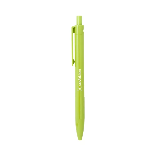 Un infaltable en tu escritorioBolígrafo retráctil. Cuerpo de diferentes colores. Acabado mate. Pulsador, clip y puntera del mismo color del cuerpo. Medidas: 1,4 x 14 cm. Materiales: Plástico ABS reciclado. Peso: 6 g. Tinta: azul