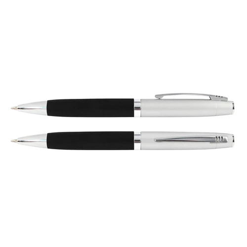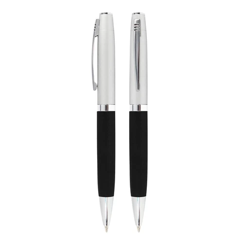 Bolígrafo Metálico bicolor modelo "Chairman". Cuerpo inferior superficie engomada negra, cuerpo superior plata satinado, terminales cromados. Escritura negra.