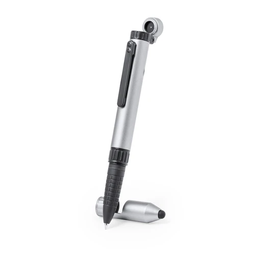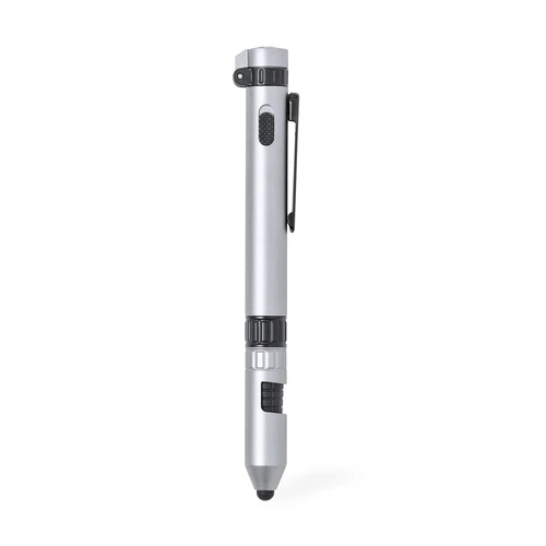 Práctico bolígrafo multifunción con 7 usos. Incluye: soporte para móvil, puntero, bolígrafo de tinta azul, linterna alimentada por pila de botón (incluida), brújula, destornillador plano y philips. Presentado individualmente en una caja de diseño kraft.