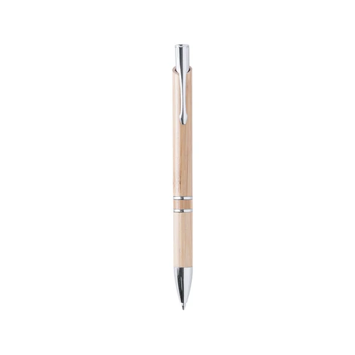 Bolígrafo de línea nature con cuerpo en madera de bambú. De mecanismo pulsador, con clip troquelado y detalles en acabado cromado. De cartucho jumbo y tinta negra.