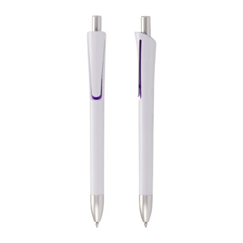 Bolígrafo plástico con cuerpo blanco mate, terminales plateados y detalle bajo el clip de color. Escritura azul.