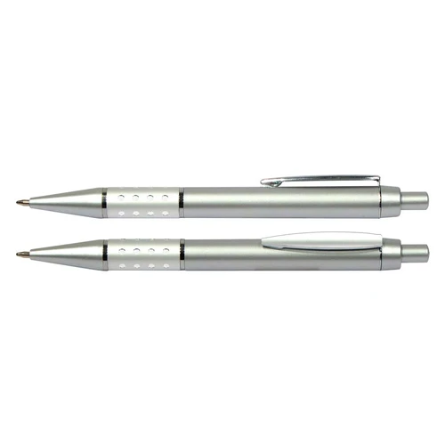 Bolígrafo Plástico Metalizado modelo "Alum", con anillo metálico con orificios. Escritura azul.