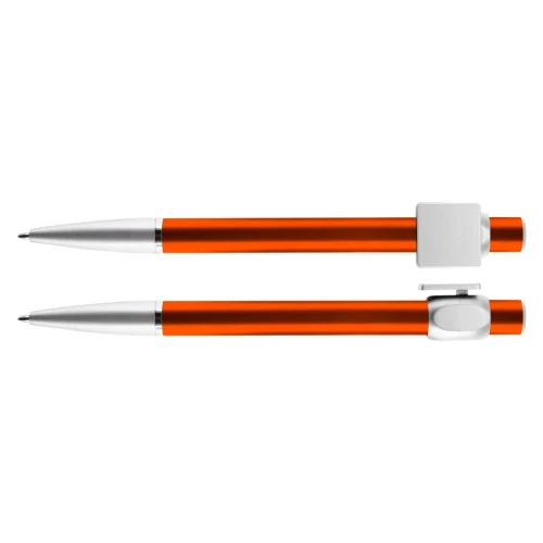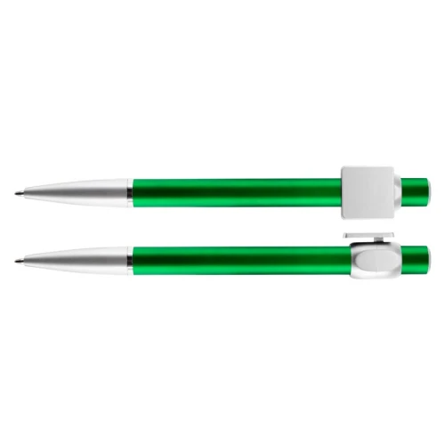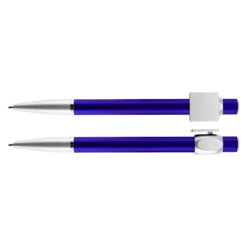 Bolígrafo "Badge" con cuerpo de color metalizado y clip cuadrado plateado, ideal para imprimir isotipos. Escritura azul.