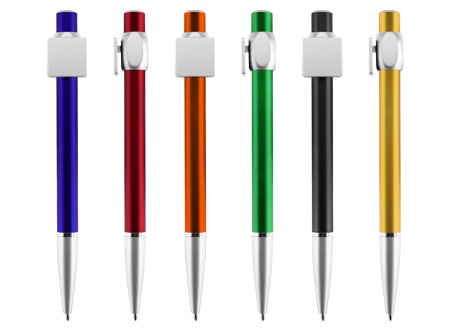 Bolígrafo "Badge" con cuerpo de color metalizado y clip cuadrado plateado, ideal para imprimir isotipos. Escritura azul.