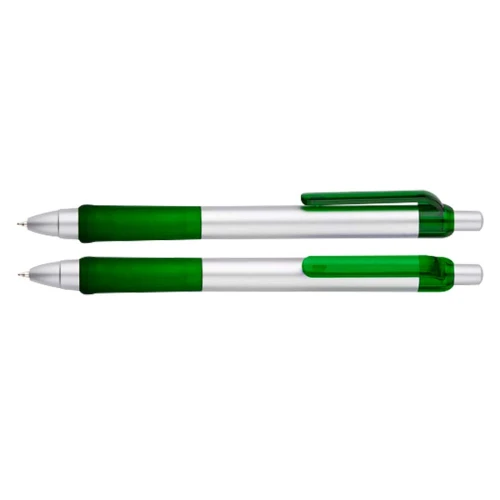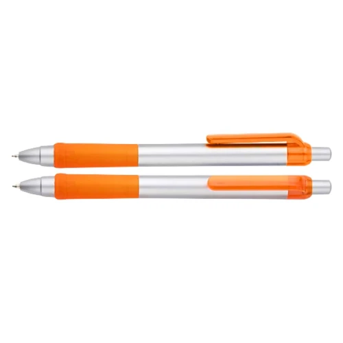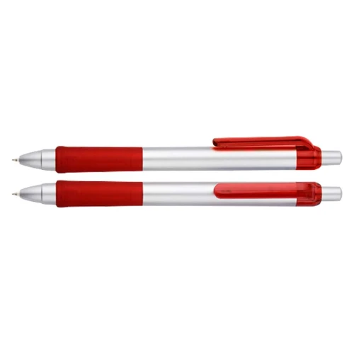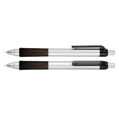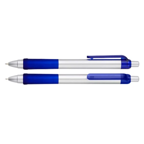 Bolígrafo plástico "Praxis" con cuerpo plateado, grip y clip de color traslúcido. Escritura azul.