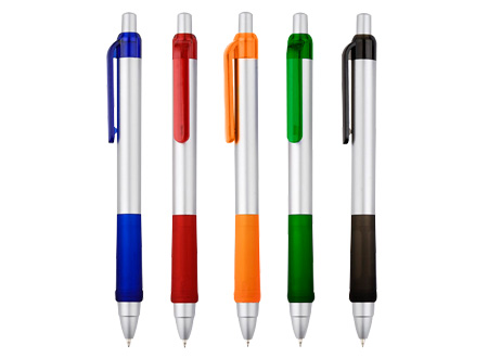 Bolígrafo plástico "Praxis" con cuerpo plateado, grip y clip de color traslúcido. Escritura azul.