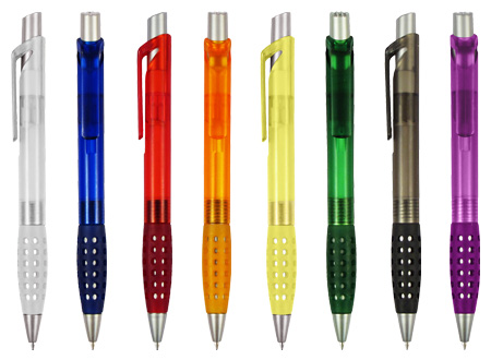 Bolígrafo plástico modelo "Punch" con grip de goma con orificios. Escritura azul.