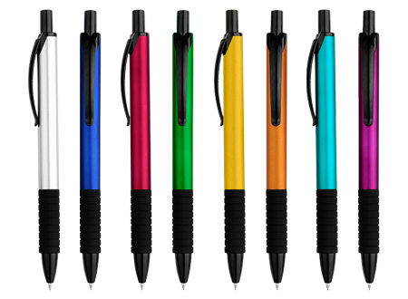 Bolígrafo "Vulcano" con cuerpo de color metalizado opaco y terminales negros. Escritura azul.