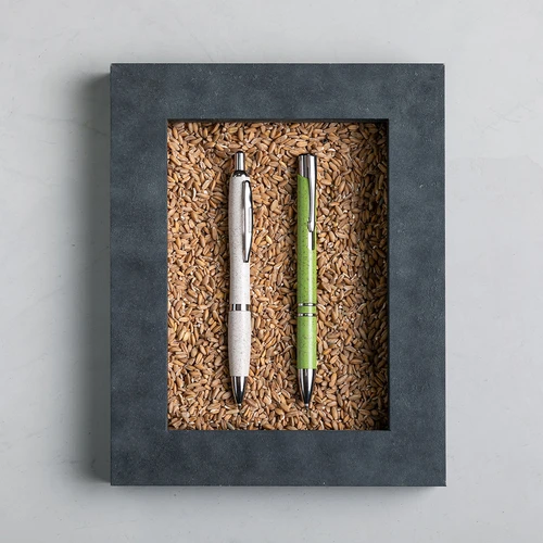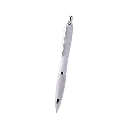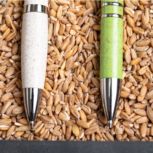 Bolígrafo de línea nature con cuerpo en caña de trigo, para así fomentar la utilización de materias primas naturales y reducir las emisiones contaminantes. De mecanismo pulsador, con detalles cromados y clip troquelado, cartucho jumbo y tinta azul. Disponible en variada gama de colores.