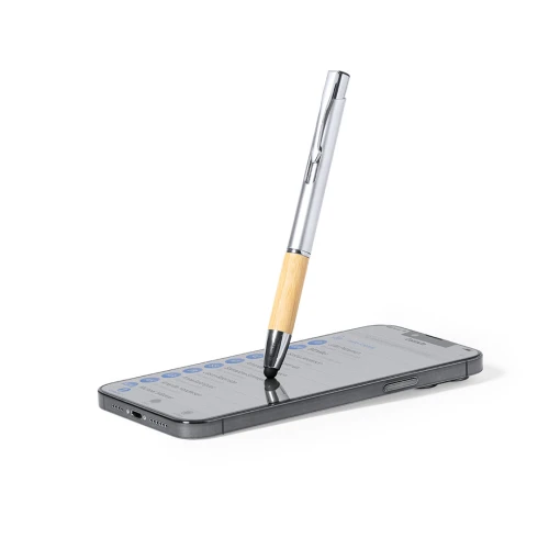 Elegante bolígrafo puntero de línea nature y mecanismo pulsador. Cuerpo en resistente ABS de acabado brillo y empuñadura en bambú, con accesorios a juego. Clip metálico, con cartucho jumbo y en tinta azul.