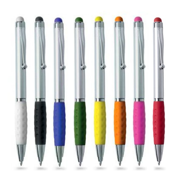 Bolígrafo puntero de mecanismo giratorio de elegante diseño bicolor con accesorios en color plateado brillante y cuerpo de suave acabado sólido en color plateado metalizado. Con clip metálico y anilla a juego. Suave empuñadura de original diseño y puntero a juego en vivos colores. Tinta azul.
