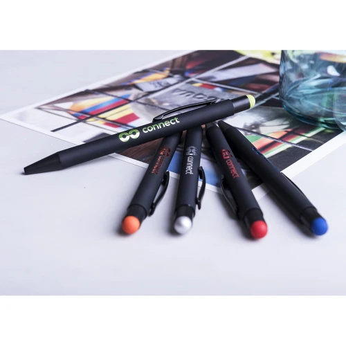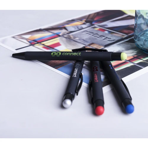 Bolígrafo puntero de mecanismo giratorio con cuerpo de acabado sólido en color negro y pulsador en variada gama de colores. Clip metálico en color negro. Especialmente diseñado para marcaje en láser y con un recubrimiento exterior especial para que tu publicidad quede perfectamente grabada, a juego con el color del puntero. Cartucho jumbo y tinta azul.
