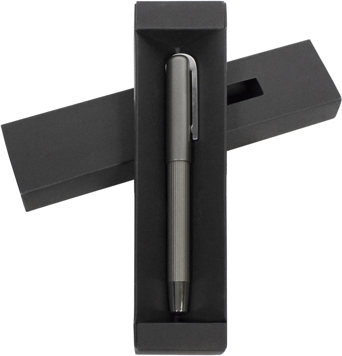 Metal. Cuerpo color plata con detalles, capuchon con clip plata brillante. Tinta gel color negra. Decape color plata. Presentación en caja de regalo.