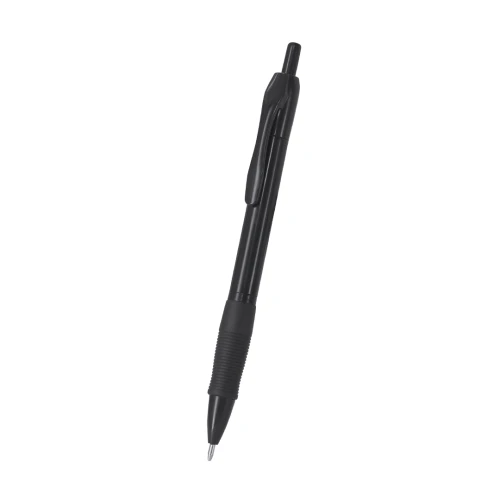 Bolígrafo de mecanismo pulsador y empuñadura disponible acabado gomoso. Fabricado en ABS de tinta negra.