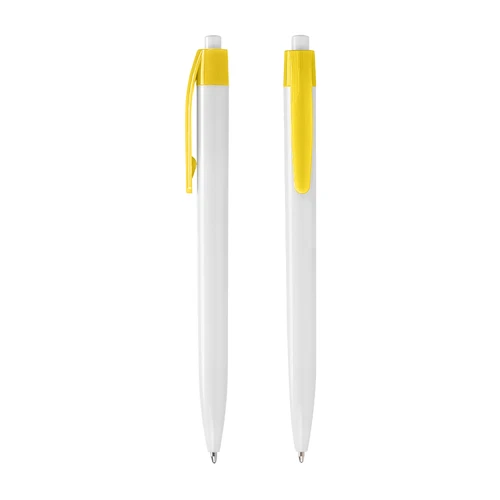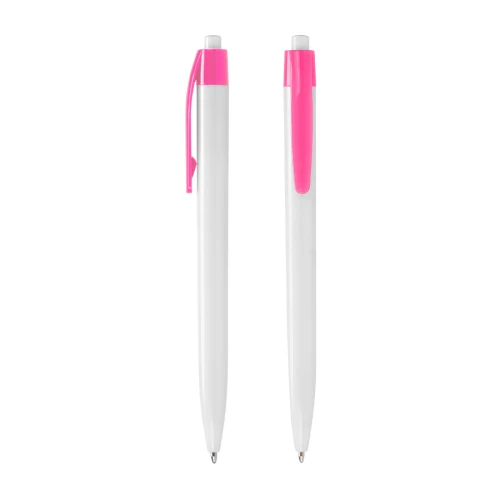 Bolígrafo plástico cuerpo blanco y clip de color. Escritura azul.
