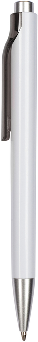 Plástico. Cuerpo blanco. Pulsador y punta color plata. Clip con detalle de color transparente. Tinta negra.
