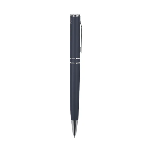 Bolígrafo con mecanismo de giro, fabricado en Aluminio Reciclado. Cuerpo con acabado mate. Incluye accesorios cromados y clip a juego. Carga jumbo y tinta azul. . Incluye distintivo Aluminio reciclado.