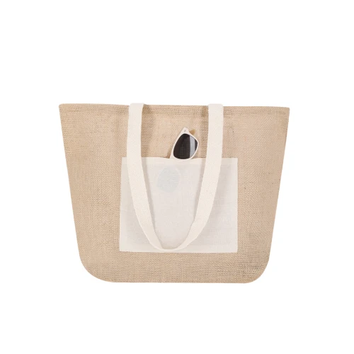 Bolsa de yute con bolsillo frontal de algodón. Con asas de algodón largas en color blanco y reforzadas. Con fuelle, de acabado cosido y resistencia hasta 10kg de peso.