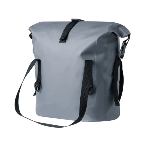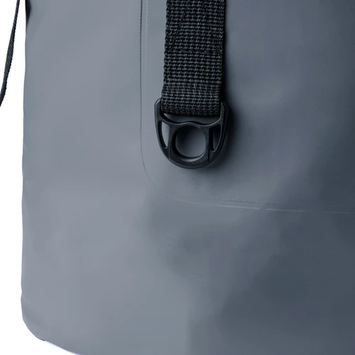 Bolso impermeable de 25L de capacidad, confeccionado en resistente PVC. Compartimento principal con triple cierre de hebilla, con asas para un cómodo transporte. En elegante color gris con detalles en negro y presentado en bolsa individual reciclada.