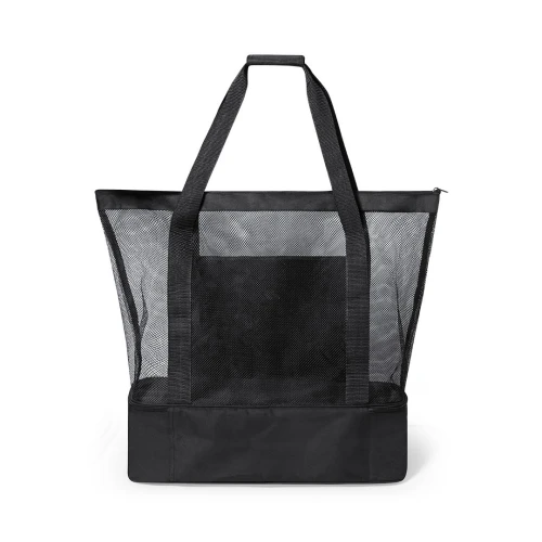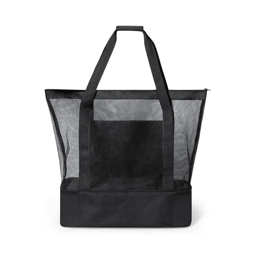 Bolsa nevera en resistente poliéster RPET 600D elaborado a partir de plástico reciclado para así fomentar la reutilización de residuos plásticos y contribuir a la sostenibilidad del planeta. Compartimento principal en redecilla tipo mesh, con cierre de cremallera. Nevera integrada en base, en resistente poliéster 600D RPET, con interior isotermo en PEVA. Asas de transporte reforzadas y amplio bolsillo frontal, con distintivo RPET en etiqueta.