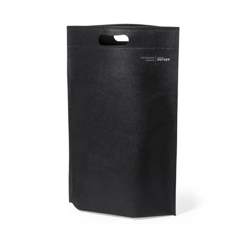 Bolsa de línea nature, fabricada en non-woven reciclado de 70g/m2. De fabricación europea, con acabado termosellado, fuelle en la base, asa reforzada troquelada y distintivo eco/made in sobre la bolsa.