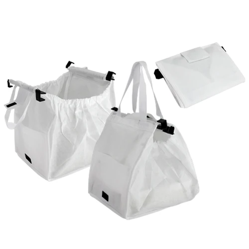 Bolsa reutilizable tela no tejida (TNT) reforzada de 100g/m2, modelo "Cart". Cuenta con 2 asas de 40cm. c/u aprox. Contiene 2 soportes plásticos rígidos negros, para enganchar en las paredes laterales de los carros de supermercados tradicionales. Sistema de cierre pestaña con velcro, bolsillo lateral y frontales superiores elasticados para maximizar la superficie de apertura sobre el carro. 100% plegable para fácil transporte y guardado.