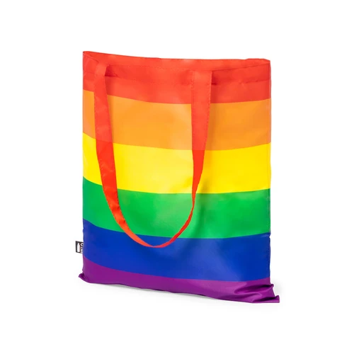 Bolsa Rainbow multicolor, fabricada en RPET 210T. De acabado cosido y asas largas reforzadas (70 x 2,5 cm). Todo un orgullo de bolsa, con distintivo RPET en etiqueta exterior.El material RPET se elabora a partir de plástico reciclado, para así fomentar la reutilización de residuos plásticos y ayudar a la sostenibilidad del planeta.