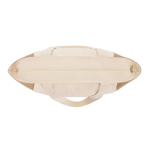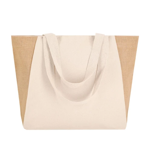 Bolsa confeccionada principalmente en algodón de 360 g/m2 y yute. Con asas de algodón largas reforzadas. Con fuelle en la base y resistencia hasta 8kg de peso.