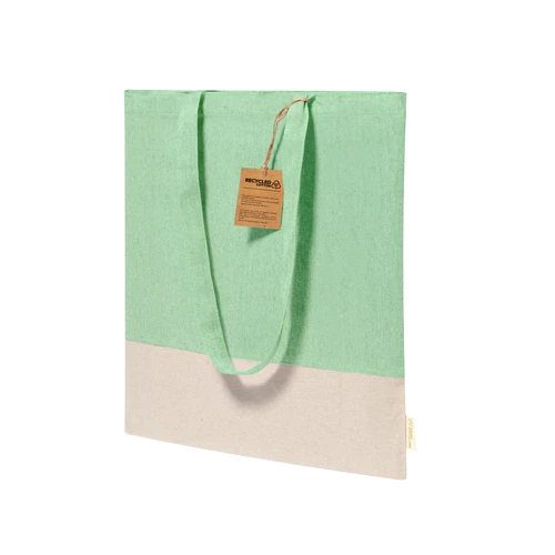Bolsa en material 100% algodón reciclado de 120 g/m2. Asas largas de 70cm con refuerzo y de acabado cosido. Logotipo en etiqueta lateral y resistencia hasta 8 kg de peso. Disponible en variada gama de colores nature con base de color natural.