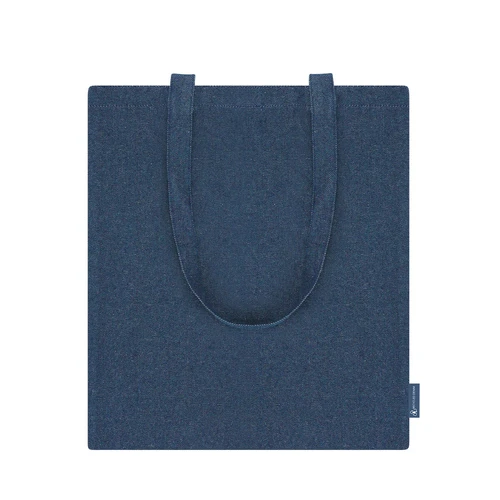 Bolsa confeccionada en tejido vaquero reciclado de 300 g/m2. Asas largas de 70cm con refuerzo, de acabado cosido. Logotipo de Denim Reciclado en etiqueta lateral y resistencia hasta 8 kg de peso.