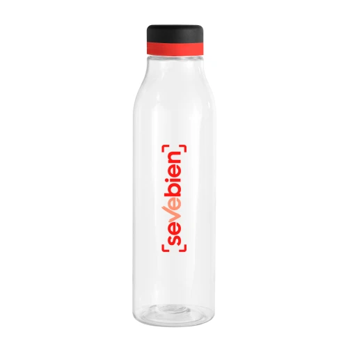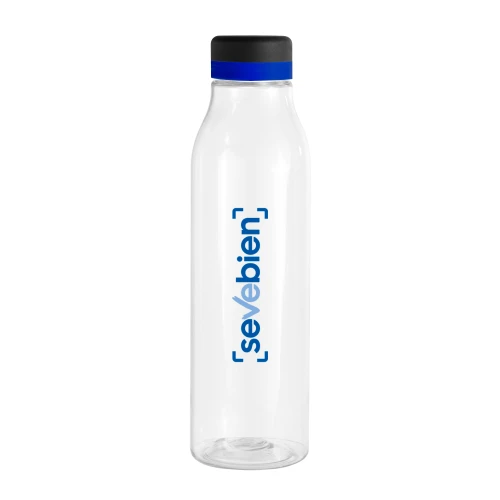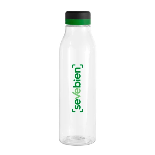 ¡Tu botella, a tu manera!Botella de plástico transparente con tapa a rosca color negro mate con anillo de silicona de diferentes colores.Medidas: Ø 7 x 24,5 cm.