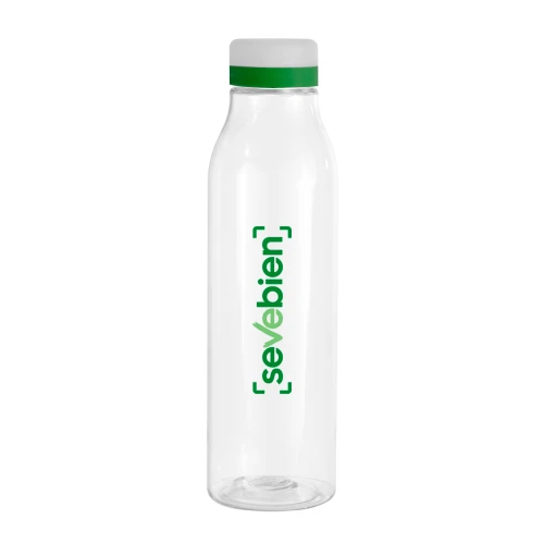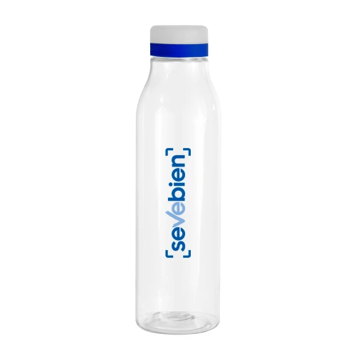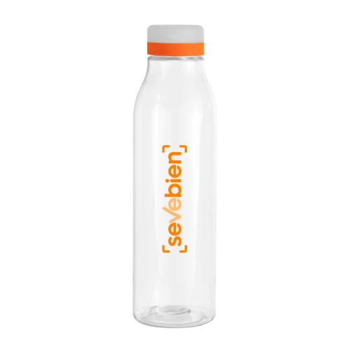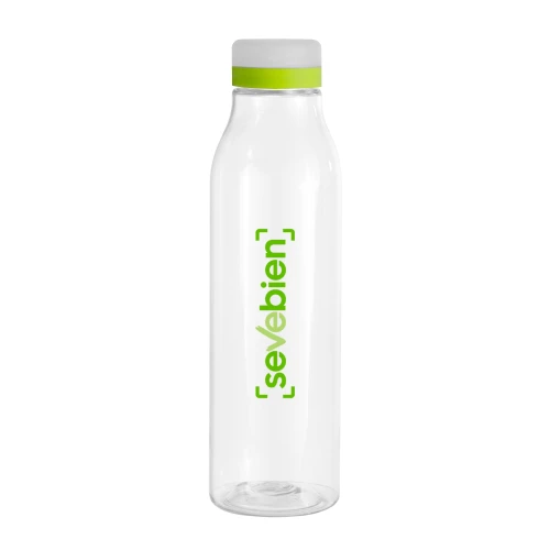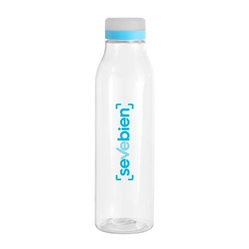 Frescura a tu lado.Botella de plástico transparente con tapa a rosca esmerilada con anillo de silicona de diferentes colores.Medidas: Ø 7 x 24,5 cm.