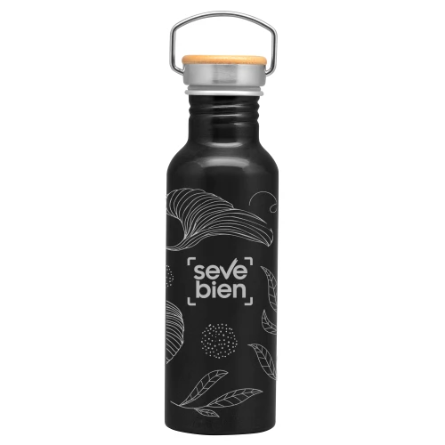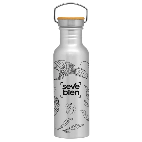 Funcionalidad AntiderrameBotella de aluminio. Tapa metálica con detalles en bambú y manija de acero para ser transportada. Interior de la tapa en plástico con anillo de silicona antiderrame.Medidas: Ø 7,3 x 24 cm.
