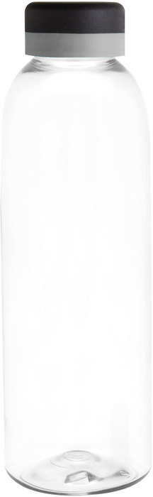 Botella de plástico transparente con tapa a rosca color negro mate con anillo de silicona de diferentes colores.
