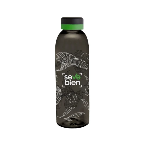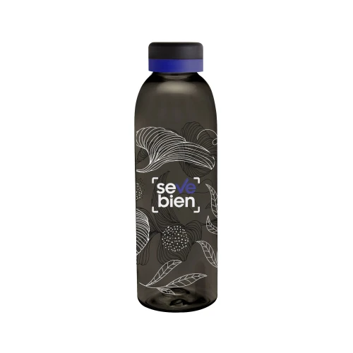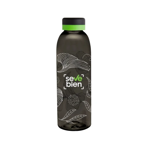 Diferencia tu estilo en un diseño con personalidad.Botella de plástico de color negro translúcido con tapa a rosca color negro mate con anillo de silicona de diferentes colores.Medidas: Ø 7 x 23 cm.