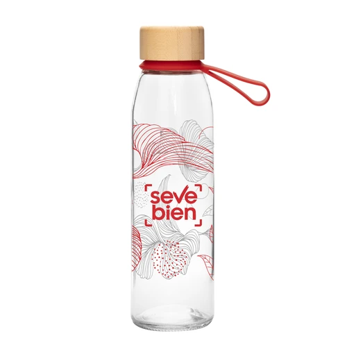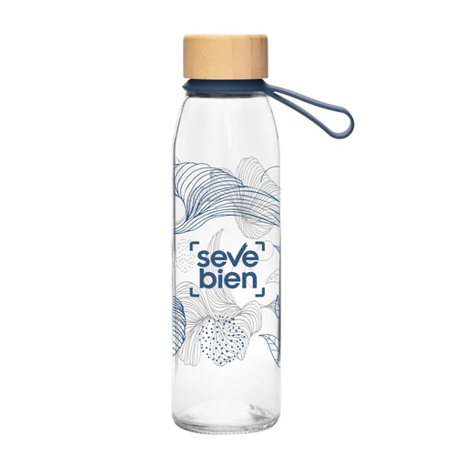 Un básico con estilo propio.Botella de vidrio. Tapa de bambú, polipropileno y anillo de silicona antiderrame. Correa de silicona de diferentes colores.Medidas: Ø 6,4 x 22,8 cm.