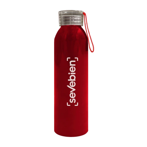 Ø 6,6 x 23,2 cm. Capacidad 600 ml. Aluminio. Botella de aluminio con cuerpo color. Tapa transparente con tira de silicona (de 8 cm) del mismo color que el cuerpo de la botella. Cuerpo de botella recubierto con pintura especial para facilitar la impresión del producto. Presentación en caja de regalo.