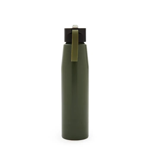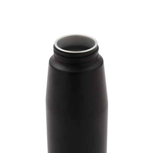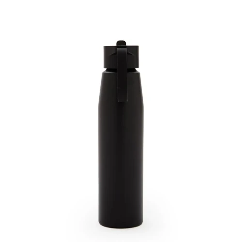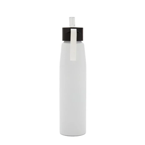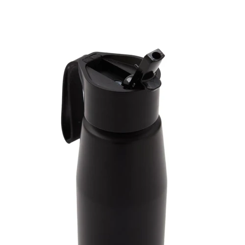 Botella de aluminio con tapa de PP negra a rosca con boquilla de PS y sorbete PE. Cuenta con una correa de silicona a tono con el color elegido para facilitar el agarre.
