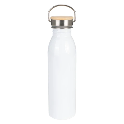 Botella blanca con cuerpo blanco para sublimación, de una sola pared de Acero inoxidable 304 SS. Producto BPA FREE, para el contacto con líquidos y alimentos. Tapa rosca de Acero inoxidable 304 SS y bamboo, con gancho de sujeción de Acero inoxidable 304 SS. Capacidad 750ml. Presentación en bolsa plástica + caja de regalo de cartón blanco. OJO: esta botella NO es térmica, se recomienda usar sólo con líquidos fríos. No llenar con lácteos o bebidas gaseosas.
