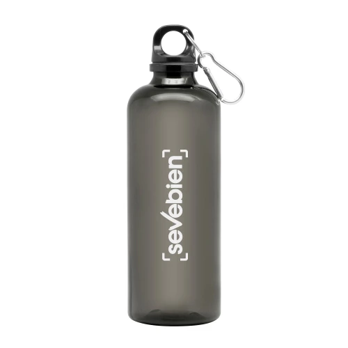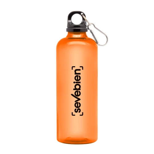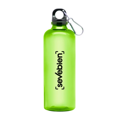 Ø 7 x 23 cm. Capacidad 600 ml. Material PET. Botella de plástico de colores translúcidos. Tapa a rosca en color negro con anillo de silicona y mosquetón de aluminio plata. Ultra liviana, pesa 60g.ATENCIÓN No utilizar con bebidas gaseosas ni líquidos calientes. / El manejo de este producto es delicado. / No exponer al sol y temperaturas altas por tiempo prolongado.