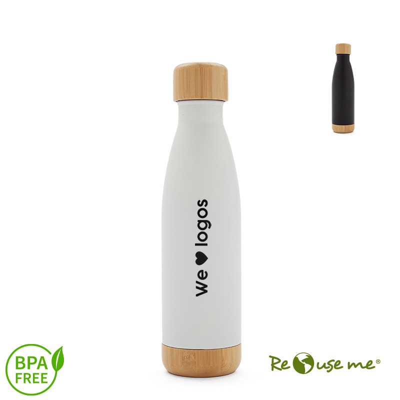 Botella de acero inoxidable y tapa de bambú con capacidad de 500 ml. El producto viene en una bolsa de PLA 100% biodegradable dentro de una caja de cartón. Dimensiones: 27,2 x 7 cm. Reuseme.