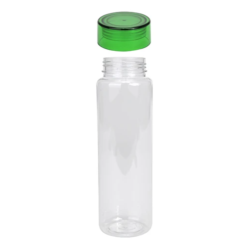 Botella plástica PET translúcido, con tapa redonda twist-off PET de color, modelo "LOUIS". Producto BPA FREE, para el contacto con líquidos y alimentos. Capacidad 600ml. Presentación en bolsa OPP + caja de regalo de cartón kraft.